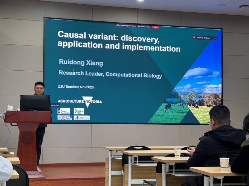 12月31日,应学院邀请,澳大利亚维多利亚州农业部农业生物研究所研究员向睿栋博士来访,并作了题为“主效变异的发现和在基因组选择中的应用”的学术报告。报告会由奶业科学研究所副所长王迪铭教授主持,吸引了众多师生参与,现场交流气氛热烈。